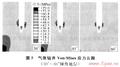 橫向比較分析不同傾角地層氣體鉆井和鉆井液鉆井的Von-Mises應(yīng)力變化趨勢(shì),由圖3、圖4、圖5、圖6綜合分析可見(jiàn):氣體鉆井井壁巖石在井底附近出現(xiàn)應(yīng)力集中,比鉆井液鉆井井壁巖石應(yīng)力值大,而且等值應(yīng)力分布面積更大,氣體鉆井比鉆井液鉆井更容易出現(xiàn)井壁不穩(wěn)定現(xiàn)象。氣體鉆井井底巖石相同等值線應(yīng)力區(qū)域面積較鉆井液鉆井應(yīng)力區(qū)域更深,巖石破壞范圍要大于鉆井液鉆井的破壞范圍,大大提高了破壞巖石效率和鉆井速度。在相同條件下,如果井眼軌跡發(fā)生偏斜,由于氣體鉆井具有較好的破巖效率,產(chǎn)生井斜可能性和幅度都更大。
