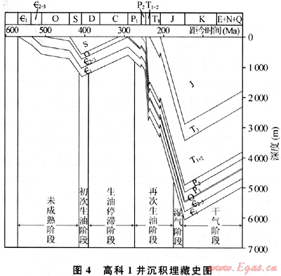 根據(jù)高科1井的沉積埋藏史圖(圖4)可見,樂山-龍女寺古隆起區(qū)下寒武統(tǒng)源巖經(jīng)歷了埋藏-抬升(剝蝕)-再埋藏-再抬升的演化過程。其有機質(zhì)生烴史可分為三期:第一期為初始生烴階段:高科1井下寒武統(tǒng)源巖在志留紀末R。值已達0.7%,處于未成熟一低成熟生烴期;第二期為生烴停滯階段,由于加里東運動的抬升作用,該井下寒武統(tǒng)源巖埋深變淺并遭受剝蝕,古地溫降低,有機質(zhì)進入生烴滯流階段;第三期為“二次生烴”階段:從二疊系開始至二疊系末,下寒武統(tǒng)源巖埋藏深度及其所具有的古地溫已超過了初始生烴階段,源巖進入了二次生烴階段。此時,高科1井毛。源巖Ro值已達0.71%,有機質(zhì)開始繼續(xù)生烴。印支末期,高科1井