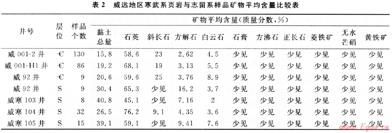 但比較四川盆地寒武系和志留系頁巖,筆者認為,四川盆地頁巖氣勘探開發(fā)的首選目標應(yīng)為川南志留系,理由如下:①盡管寒武系和志留系烴源巖都有較高的有機碳豐度和較好的有機質(zhì)類型,但志留系烴源巖的成熟度略低于寒武系。②運聚條件不同,志留系烴源巖在川南地區(qū)生烴強度大于川東地區(qū),但在川東地區(qū),石炭系直接覆蓋在志留系之上,由于石炭系有較好的滲儲條件,所以形成大中型氣田[5],而川南地區(qū)雖處生烴凹陷,但由于石炭系缺失,所以二疊系直接覆蓋在志留系之上,而二疊系孔隙不發(fā)育,滲儲空間主要為裂縫。已有的研究表明,二疊系甚至三疊系嘉陵江組都有天然氣來自志留系,但沒有形成向石炭系那樣的大氣田。顯然川南地區(qū)志留系排烴程度沒有川東地區(qū)高,換句話說,滯留在川南志留系中的天然氣應(yīng)當較多。據(jù)不完全統(tǒng)計,川南地區(qū)鉆遇志留系有氣顯示的井有8口,也說明這一現(xiàn)象。寒武系生烴條件最好的地區(qū)是川西南地區(qū),而它受樂山龍女寺古隆起的影響較大,具備向震旦系輸氣的條件,也就是說它自身滯留天然氣的條件不如川南志留系。③礦物成分不同。從表2可見,威遠地區(qū)寒武系頁巖的石英含量與志留系差不多,但黏土含量低于志留系的頁巖,而黏土與吸附氣的多少有關(guān),石英則與造縫能力相關(guān)。