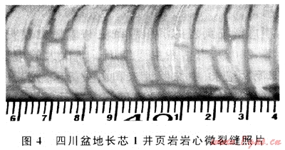 上揚(yáng)子地區(qū)除四川盆地外,其余地區(qū)勘探程度非常低,且無(wú)論是四川盆地還是四川盆地以外的探區(qū),已往的油氣勘探實(shí)踐中,都沒(méi)有把頁(yè)巖地層當(dāng)做有效目的儲(chǔ)層對(duì)待。因此,開展頁(yè)巖儲(chǔ)層的研究甚少[3~4]。四川盆地長(zhǎng)寧構(gòu)造所鉆的長(zhǎng)芯1井8個(gè)志留系頁(yè)巖樣品的巖礦組成分析結(jié)果見(jiàn)表1。長(zhǎng)寧構(gòu)造龍馬溪組頁(yè)巖巖礦組成中,黏土最多,含量為26.5%~59.5%,平均48.25%,其次是石英,含量為20.5%~29.7%,平均25.3%,方解石含量為4.1%~26.9%,平均12.4%。與美國(guó)已知含氣頁(yè)巖相比,該井硅質(zhì)(石英)含量偏少,而黏土(伊利石為主)含量偏高,根據(jù)美國(guó)經(jīng)驗(yàn),這似乎對(duì)頁(yè)巖儲(chǔ)層的脆性有影響。但仔細(xì)分析發(fā)現(xiàn),該井的方解石總量較高,石英和方解石總量達(dá)37%,表明該套頁(yè)巖具有脆性巖石組分。野外剖面可見(jiàn)風(fēng)化破碎的龍馬溪組筆石頁(yè)巖,且在露頭和長(zhǎng)芯1井巖心上均可發(fā)現(xiàn)頁(yè)巖高角度縫和微裂縫十分發(fā)育(圖4),揭示了該區(qū)頁(yè)巖具有良好的脆性特征。