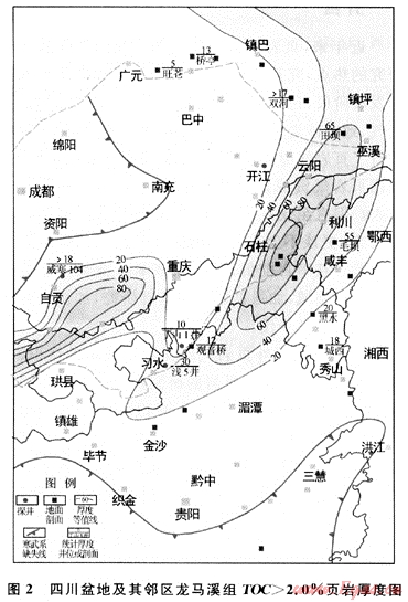 圖2是四川盆地及其鄰區(qū)下志留統(tǒng)龍馬溪組TOC>2.0%的黑色頁(yè)巖累計(jì)厚度分布圖。由圖2可見(jiàn),龍馬溪組TOC>2.0%高值區(qū)分布于川東石柱-鄂西利川,黑色頁(yè)巖厚達(dá)100m,川北鎮(zhèn)巴黑色頁(yè)巖厚20m,川南瀘州一帶厚60~80m。3個(gè)高值區(qū)的分布在地質(zhì)上和川東-鄂西深水陸棚沉積相帶、川北深水陸棚沉積相帶以及川南深水陸棚沉積相帶分布相吻合。