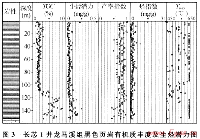 對(duì)上揚(yáng)子地區(qū)下志留統(tǒng)龍馬溪組有機(jī)碳含量統(tǒng)計(jì),發(fā)現(xiàn)下志留統(tǒng)龍馬溪組有機(jī)碳含量變化大,分布在0.1%~8.65%之間,多數(shù)大于1%。長(zhǎng)寧-珙縣地區(qū)鉆探的長(zhǎng)芯1井,通過(guò)對(duì)龍馬溪組下部黑色頁(yè)巖153m連續(xù)取心的有機(jī)碳含量分析(圖3)同樣反映出這種變化特征。在110m以淺,TOC含量處在1%~3%之間,平均為2%,110~153m井段(龍馬溪組最底部)TOC均大于2%,平均值可達(dá)到6%。全井段統(tǒng)計(jì),TOC>2.0%的累計(jì)厚度可達(dá)80m,主要分布于龍馬溪組下段(包括上奧陶統(tǒng)約10m的五峰組碳質(zhì)頁(yè)巖),這將是形成頁(yè)巖氣藏最有利層段。