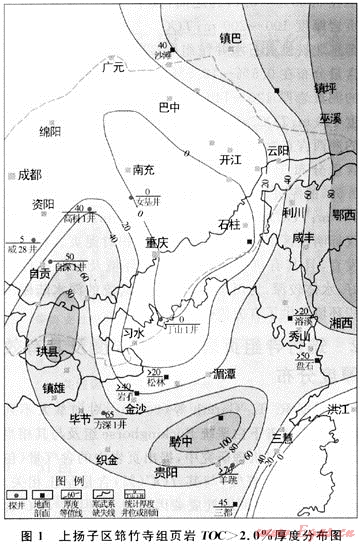 據(jù)Charles Boyer等(2006)[5]把源巖有機質(zhì)豐度定為6級,即TOC<0.5%為很差;0.5%~1%為差;1%~2%為一般;2%~4%為好;4%~12%為很好;TOC>12%為極好。美國從事頁巖氣藏勘探開發(fā)的油公司一般將有效頁巖TOC含量下限值確定為2.0%。筆者采用這一下限值,并依據(jù)上揚子區(qū)下寒武統(tǒng)筇竹寺組頁巖TOC含量實測標定資料及相應厚度分布,編制了該區(qū)筇竹寺組頁巖TOC≥2.0%的頁巖厚度分布圖(見圖1)。
