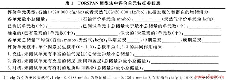 福斯潘法涉及參數(shù)眾多,基本參數(shù)有評(píng)價(jià)目標(biāo)特征、評(píng)價(jià)單元特征、地質(zhì)地球化學(xué)特征和勘探開發(fā)歷史數(shù)據(jù)等(見表1、2)[3]。USGS在2003年、2008年用該方法對(duì)沃斯堡盆地Barnett頁(yè)巖氣資源做了估算,2003年評(píng)價(jià)結(jié)果為7400×108m3,2008年評(píng)價(jià)結(jié)果為2.66×108m3。兩次評(píng)價(jià)相差3.6倍,原因在于沃斯堡盆地頁(yè)巖氣藏含氣范圍擴(kuò)大至原來(lái)的3倍,整個(gè)盆地成為有利頁(yè)巖氣產(chǎn)區(qū),其次是頁(yè)巖氣井生產(chǎn)周期變長(zhǎng),由初期評(píng)價(jià)時(shí)的30a增長(zhǎng)到50a,其核心產(chǎn)區(qū)的生產(chǎn)周期甚至估算結(jié)果不是一成不變,是動(dòng)態(tài)評(píng)價(jià)過程,同時(shí)也說明了頁(yè)巖氣資源的復(fù)雜性。