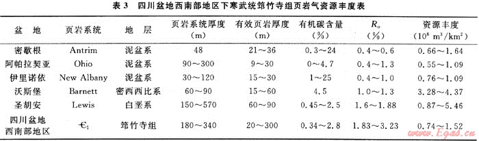 為確定四川盆地西南部地區(qū)下寒武統(tǒng)筇竹寺組頁(yè)巖氣資源豐度,筆者在威遠(yuǎn)氣田區(qū)實(shí)施了1口鉆井密閉取心,并對(duì)其進(jìn)行巖心吸附氣含量測(cè)試。威遠(yuǎn)氣田區(qū)下寒武統(tǒng)筇竹寺組頁(yè)巖有機(jī)碳含量為0.34%~2.8%,吸附氣含量0.43~0.86m3/t。需要說明的是根據(jù)區(qū)域地層研究,上述鉆井沒能得到該組中最好的黑色頁(yè)巖和碳質(zhì)頁(yè)巖段巖心,因此,測(cè)得的有機(jī)碳與吸附氣含量?jī)H具有不完全代表性,這一問題有待繼續(xù)研究。將筇竹寺組頁(yè)巖特征與美國(guó)五大頁(yè)巖氣含氣盆地對(duì)比(見表3),確定出四川盆地西南部地區(qū)下寒武統(tǒng)筇竹寺組頁(yè)巖氣資源豐度為0.74×108~1.52×108m3/km2。