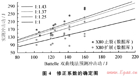 新頒布的ISO 3183 2007中給出了幾種常用的止裂韌性預(yù)測方法的適用范圍(見表2)??梢姡瑢?duì)于西二線,只有Battelle雙曲線法適用。ISO 3183—2007進(jìn)一步指出,當(dāng)預(yù)測結(jié)果大于100J時(shí),應(yīng)對(duì)預(yù)測結(jié)果進(jìn)行修正。而修正系數(shù)是由已經(jīng)進(jìn)行的全尺寸實(shí)物爆破試驗(yàn)結(jié)果確定的。由圖4得出西二線止裂韌性修正系數(shù)為1.43。幾種預(yù)測結(jié)果對(duì)比如表3所示。