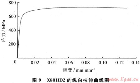 用于西二線的抗大變形鋼管已試制成功。表4是西二線抗大變形管線鋼技術(shù)條件對(duì)縱向拉伸性能的要求。表5為外徑1219mm、壁厚22mm X80HD2鋼管的縱向拉伸性能測試結(jié)果。圖9為其縱向拉伸曲線。根據(jù)此拉伸曲線,利用FEM(Finite Element Method)方法進(jìn)行壓縮和彎曲載荷下的應(yīng)變能力計(jì)算,結(jié)果見表6。
