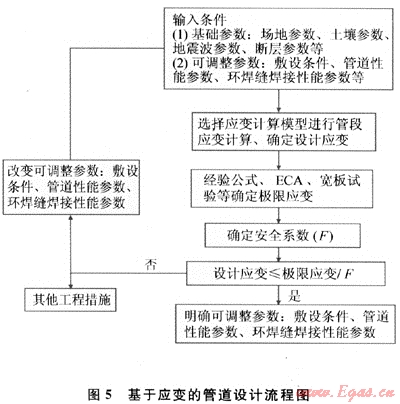中石油《西氣東輸二線工程關(guān)鍵技術(shù)研究》重大專項(xiàng)設(shè)置課題研究了西二線基于應(yīng)變的設(shè)計(jì)方法并進(jìn)行了抗大變形管線鋼的研究與開發(fā)。中石油規(guī)劃設(shè)計(jì)總院和管道設(shè)計(jì)院編制了《西氣東輸二線管道工程強(qiáng)震區(qū)和活動(dòng)斷層區(qū)段埋地管道基于應(yīng)變設(shè)計(jì)導(dǎo)則》[10~11]?;趹?yīng)變的管道設(shè)計(jì)流程如圖5所示。核心環(huán)節(jié)是設(shè)計(jì)應(yīng)變小于等于極限應(yīng)變/安全系數(shù)。此處的極限應(yīng)變就是鋼管應(yīng)力-應(yīng)變曲線中的屈曲應(yīng)變。它可以直接由鋼管實(shí)物試驗(yàn)測出,也可由經(jīng)驗(yàn)公式、ECA(Engineer Critical Assessment)、寬板試驗(yàn)等確定。