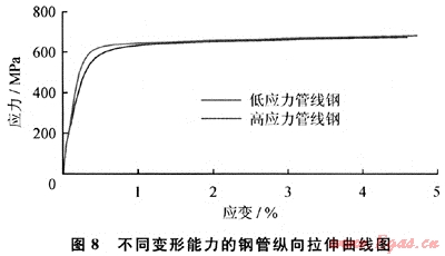 形變強(qiáng)化指數(shù)在測試上有一定難度。為了在生產(chǎn)中便于控制,用控制應(yīng)力比的方法來代替形變強(qiáng)化指數(shù)控制。應(yīng)力比是對(duì)應(yīng)兩個(gè)應(yīng)變水平的應(yīng)力的比值,如Rt1.5/Rt0.5、Rt2.0/Rt1.0等。這是描述應(yīng)力應(yīng)變行為的一個(gè)重要方法。由于變形能力較強(qiáng)的鋼管與普通鋼管拉伸曲線的主要區(qū)別是在屈服初期,所以Rt1.5/Rt0.5可能更能描述二者之間的區(qū)別(圖8)。