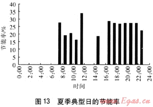 PEMFC建筑熱電聯(lián)供系統(tǒng)的節(jié)能率定義為滿足相同的電、熱水需求條件,PEMFC建筑熱電聯(lián)供系統(tǒng)比基準方案節(jié)約燃料量與基準方案消耗燃料最之比。PEMFC建筑熱電聯(lián)供系統(tǒng)在冬季工況和夏季工況的節(jié)能率見圖12、13。