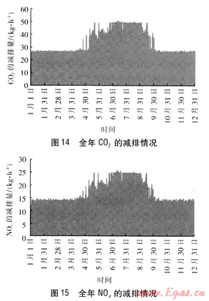 圖14、15為PEMFC建筑熱電聯(lián)供系統(tǒng)全年的C02和N0x的減排情況,涂黑區(qū)域的上邊界線表示系統(tǒng)運行時的污染物減排量,下邊界線表示系統(tǒng)不運行時污染物減排量為0。PEMFC建筑熱電聯(lián)供系統(tǒng)在夏季的減排效果明顯,這是因為夏季有時是2臺電池堆同時運行。模擬計算結(jié)果為:PEMFC建筑熱電聯(lián)供系統(tǒng)與基準方案相比,全年可減排C02量為133.2t,減排N0x量為67.1t。