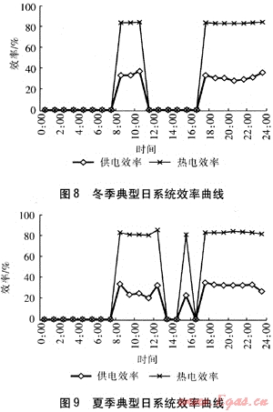 圖8、9為PEMFC建筑熱電聯(lián)供系統(tǒng)冬、夏兩季典型日的效率情況。在系統(tǒng)運行時,系統(tǒng)的供電效率大部分時間維持在30%~38%,熱電效率可達80%以上,夏季PEMFC建筑熱電聯(lián)供系統(tǒng)的使用率高于冬季。