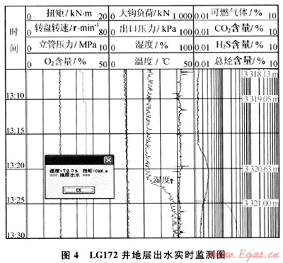 鉆至井深3320.63m時(shí)濕度開始快速升高,至井深3321.00m上升至78%(圖4);觀察出口返出的巖屑較少,顏色深,具濕潤(rùn)感,部分呈團(tuán)塊狀,經(jīng)綜合分析,判斷地層出水,及時(shí)進(jìn)行了預(yù)警。
