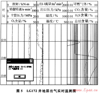 LG172井,2009年11月28日氮?dú)忏@進(jìn)在12:54時(shí)發(fā)現(xiàn)可燃?xì)怏w參數(shù)明顯升高,至12:58時(shí)井深3255.58m發(fā)現(xiàn)綜合錄井儀的氣測(cè)總烴含量明顯升高——含量由0.0723%↗6.6719%。“氣體鉆井實(shí)時(shí)監(jiān)測(cè)系統(tǒng)”連續(xù)彈出“氣測(cè)異常”報(bào)警對(duì)話框(圖5)。