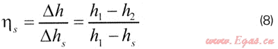 在透平膨脹機中,標志能量轉換過程完善程度的指標就是效率。從理論上來說,膨脹工質在給定的進、出口條件下可能實現(xiàn)的最大比焓降應為等熵比焓降△hs,因此等熵比焓降是一個比較的標準。透平膨脹機進、出口實際比焓降△h與等熵比焓降之比稱為等熵效率[14]: