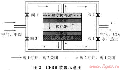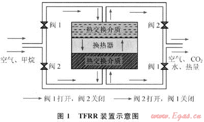 開始運(yùn)行時,電熱元件對熱交換介質(zhì)進(jìn)行預(yù)熱,使之達(dá)到反應(yīng)所需要的溫度。一個循環(huán)包括兩次風(fēng)流轉(zhuǎn)向,每一次轉(zhuǎn)向稱為一個半循環(huán)。在第一個半循環(huán)中,甲烷和空氣的混合物以常溫通入反應(yīng)器,閥1打開,閥2關(guān)閉,風(fēng)流從反應(yīng)器頂部流向底部,當(dāng)空氣和甲烷的混合物到達(dá)熱交換介質(zhì)時發(fā)生氧化反應(yīng),放出熱量。產(chǎn)生的熱量及反應(yīng)產(chǎn)物持續(xù)通過反應(yīng)器的出口,出口處的熱交換介質(zhì)不斷吸熱,從而溫度不斷升高。而入風(fēng)側(cè)因風(fēng)流以常溫通過,熱交換介質(zhì)不斷被冷卻,當(dāng)冷卻到一定溫度時,反應(yīng)器自動轉(zhuǎn)換風(fēng)流方向,進(jìn)入第二個半循環(huán)。風(fēng)流從高溫側(cè)進(jìn)入,并吸收熱交換介質(zhì)的熱量,從而達(dá)到自燃溫度。反應(yīng)生成的熱量,一部分被熱交換器吸收,另一部分用于補(bǔ)償熱損失,從而往復(fù)循環(huán)。
