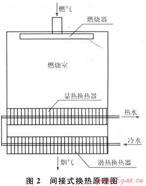 間接式換熱采用間壁式換熱器進(jìn)行換熱,高溫?zé)煔馔ㄟ^間壁式換熱器加熱(圖2)。目前國內(nèi)市場(chǎng)上的冷凝式熱水器大多采用這種形式。一般采用兩個(gè)換熱器,一個(gè)為顯熱換熱器,保持較高的煙氣溫度,煙氣不產(chǎn)生冷凝,僅吸收煙氣中的顯熱;另一個(gè)換熱器為潛熱換熱器,煙氣流過時(shí),水蒸氣發(fā)生冷凝,同時(shí)釋放顯熱和潛熱。煙氣中的酸性氣體會(huì)溶于冷凝水從而生成腐蝕性液體。圖示結(jié)構(gòu)布置是諸多采用間壁式冷凝換熱形式中的一種,采用“倒燒”形式主要是便于冷凝水的排放以及有利于增大煙氣側(cè)換熱系數(shù)。