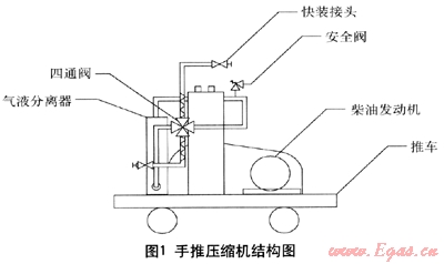圖1所示的手推式壓縮機采用活塞式小型壓縮機,動力源采用手搖啟動式柴油隔爆發(fā)動機。四通閥主要用于改變管路中氣流前進方向,從而實現(xiàn)不拆卸情況下的輸送方向,滿足卸車和氣相回收的功能。壓縮機出口安裝有安全閥,當?shù)构尴掠螇毫^高時對壓縮機設備進行保護。整個橇體的進出口采用快裝接頭,使設備在現(xiàn)場的快速安裝成為可能。