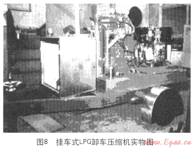 圖7手推式LPG卸車壓縮機可以實現(xiàn)在小片區(qū)域的人工改變位置,從而為小片區(qū)域的多個卸車點進行卸車;圖8為掛車式LPG卸車壓縮機,其中配備了更加齊全的附加設備,從而實現(xiàn)了大片區(qū)域的不同地點的卸車需求。目前該種移動式應急卸車設備在香港加德士石油公司、香港加德士石油公司、香港殼牌有限公司及汕頭加德士海洋燃氣有限公司配備使用,應該算作是用于搶險卸車的雛形狀態(tài)。