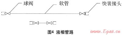 液相管路(圖4)主要是實現(xiàn)事故槽車、閥門組和搶險槽車的連接,主要包括球閥、軟管和快裝接頭。分為長短兩種,長的那根用于事故槽車和閥門組的連接,短的用于閥門組和搶險槽車的連接。