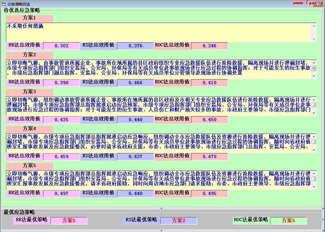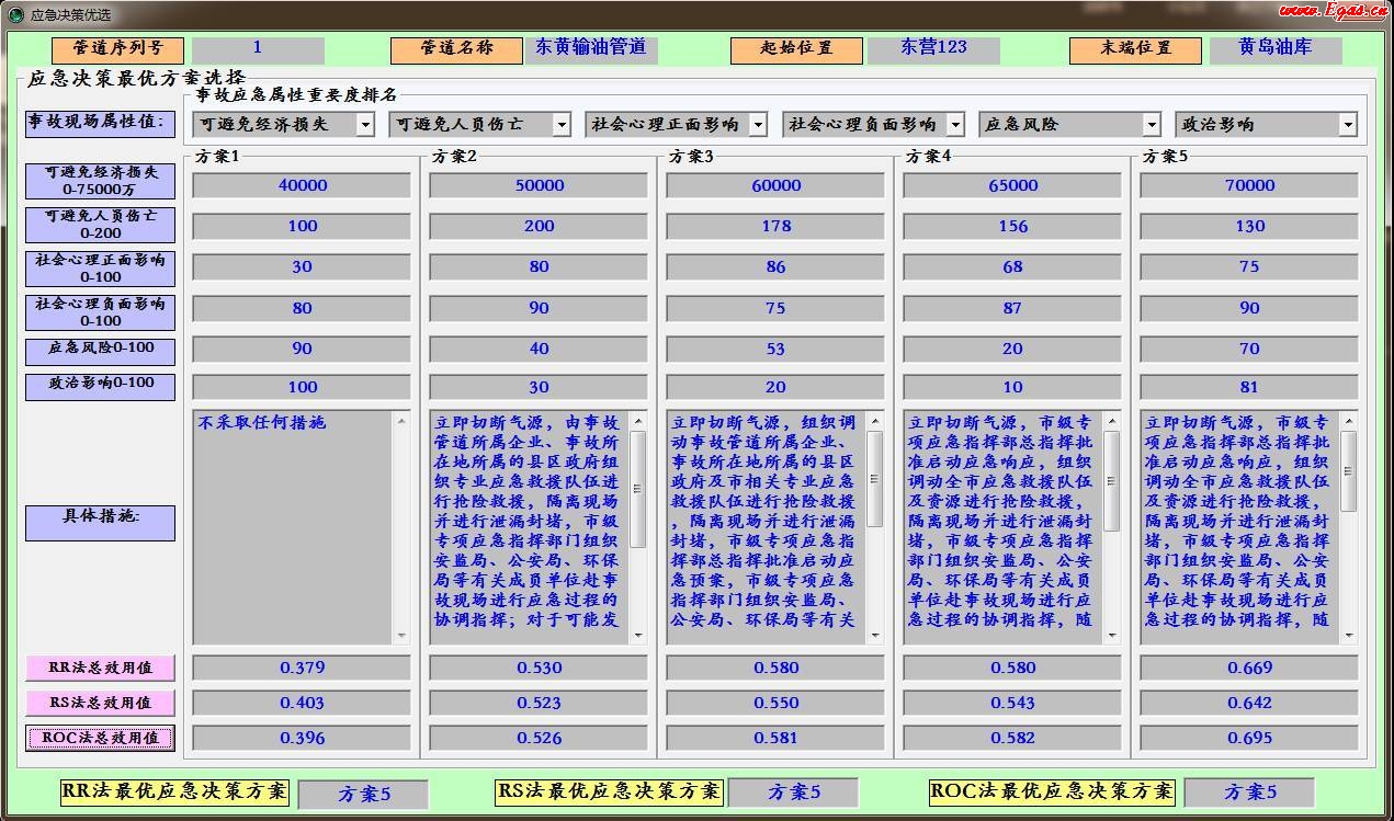(3)通過比較現(xiàn)有預(yù)選應(yīng)急方案的效用值,遴選出最有效的應(yīng)急方案,使得管道重大事故發(fā)生時(shí)的應(yīng)急方案決策更加科學(xué)合理,相關(guān)企業(yè)或政府部門決策更加迅速。系統(tǒng)操作簡單、穩(wěn)定性強(qiáng),可在城市油氣管道管理企業(yè)中推廣使用。