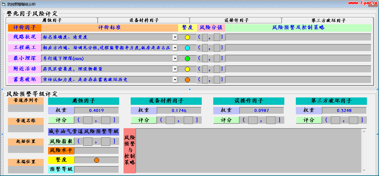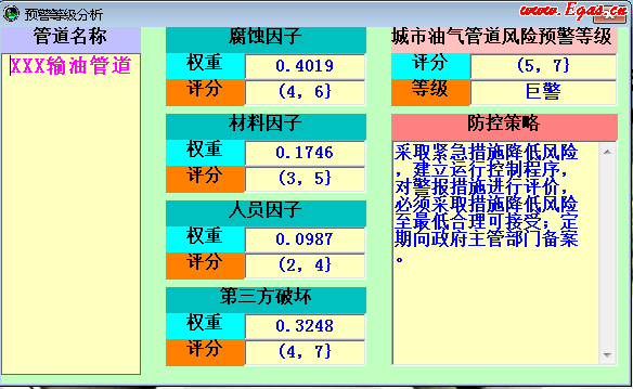 根據(jù)評價(jià)因子中所羅列的因素,在對應(yīng)評價(jià)標(biāo)準(zhǔn)下拉菜單中選擇符合實(shí)際現(xiàn)場管道情況后,軟件自行判斷其對應(yīng)的警度、風(fēng)險(xiǎn)分值、風(fēng)險(xiǎn)預(yù)警及控制策略,各評價(jià)因子的風(fēng)險(xiǎn)評定結(jié)果如圖 8—11所示。 風(fēng)險(xiǎn)評定之后,依據(jù)改進(jìn)的肯特(W.Kent)管道風(fēng)險(xiǎn)評價(jià)方法(piperiskmanagementmanual),參考著名油氣儲(chǔ)運(yùn)專家潘家華教授提出的風(fēng)險(xiǎn)模型,結(jié)合城市油氣管道風(fēng)險(xiǎn)現(xiàn)狀,給出各風(fēng)險(xiǎn)評定因子的權(quán)重分配,計(jì)算每個(gè)評定因子的評分錄入預(yù)警等級(jí)分析界面(如圖 12所示),再計(jì)算出最終該管道的評分區(qū)間為(5,7),對照城市油氣管道相對風(fēng)險(xiǎn)指數(shù)警度分級(jí)表得出預(yù)警等級(jí)為高風(fēng)險(xiǎn)巨警,并給出相應(yīng)的防控策略。