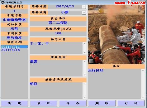 可方便地實(shí)現(xiàn)城市油氣管道主要性能參數(shù)的查閱、修改等功能,以管道為項(xiàng)目單位進(jìn)行管理,主要包括管道基本信息、運(yùn)行狀態(tài)信息、維修信息、事故信息四部分。維修信息窗口如圖4所示,事故管理窗口如圖 5所示。