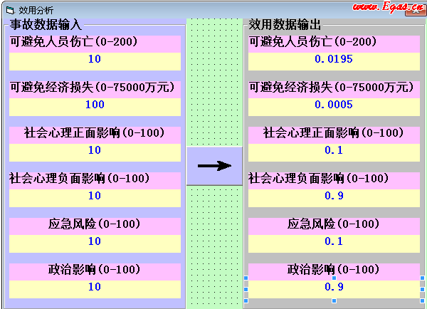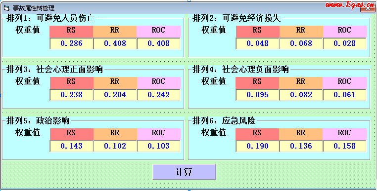 主要包括事故屬性值設(shè)定與屬性重要度排名區(qū)和應(yīng)急方案總效用值計(jì)算區(qū)兩大部分,界面如圖 7所示。