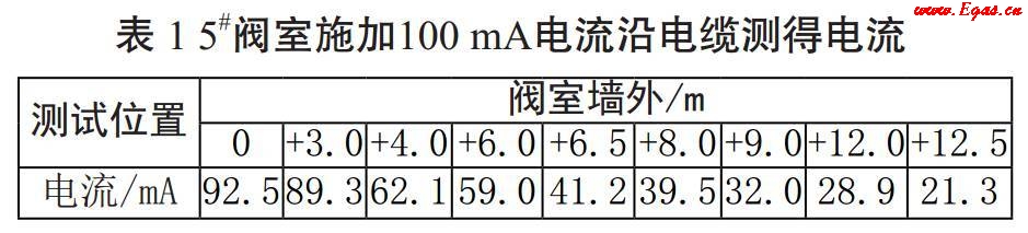 將RD8000的發(fā)射機(jī)正極連接陽(yáng)極電纜,負(fù)極接地,調(diào)節(jié)適當(dāng)頻率。打開電源,輸出正常。打開接收機(jī)電源,調(diào)節(jié)頻率與接收機(jī)一致,查找電纜位置走向,同時(shí)測(cè)量電流大小。當(dāng)電纜上方前后電流大小有明顯變化時(shí),初步判斷該處電纜斷點(diǎn)或虛接(表 1)。