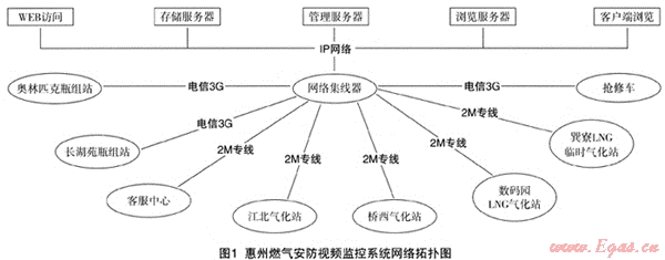 根據(jù)各場站的監(jiān)控點數(shù)及分布位置情況,分別采取不同的通訊線路選擇,傳輸至公司總部監(jiān)控中心。數(shù)碼同LNG氣化站、橋西氣化站江北氣化站和客戶服務(wù)中心結(jié)合辦公網(wǎng)絡(luò),租用電信2M帶寬光纖專線,進行視頻數(shù)據(jù)的傳輸。