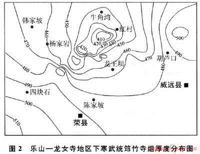 2) 下寒武統(tǒng)頁巖地層:分布面積大、范圍廣,可及整個揚(yáng)子地臺區(qū),現(xiàn)今殘留面積約90×104km2。烴源巖厚度50~500m,其中厚度大于50m以上烴源巖面積約58×104km2。發(fā)育的層位相當(dāng)穩(wěn)定,以下寒武統(tǒng)筇竹寺組為主,與之相當(dāng)?shù)倪€有川黔鄂地區(qū)的牛蹄塘組或水井沱組、蘇浙皖地區(qū)的荷塘組、冷泉王組等。巖性主要為暗色頁巖、黑色碳質(zhì)頁巖、碳硅質(zhì)頁巖、黑色粉砂質(zhì)頁巖。上揚(yáng)子地區(qū)的滇東、黔東北地區(qū)的頁巖地層普遍含磷,下?lián)P子地區(qū)夾石煤層。有機(jī)碳含量多在2.0%以上,最高可達(dá)13.64%,平均為2.77%。四川盆地下寒武統(tǒng)筇竹寺組井下樣品測試,有機(jī)碳含量平均為0.36%~5.03%,露頭樣品分析,有機(jī)碳含量平均為1.92%~2.35%(表3)。母質(zhì)類型以腐泥型干酪根為主,少量為腐殖型。干酪根δ13C為-29.82‰~-32.92‰(PDB),平均為-30.88‰,成烴潛力大。上揚(yáng)子與下?lián)P子地區(qū)頁巖演化程度較高,Ro一般大于3%,最高可至5%及以上;中揚(yáng)子地區(qū)頁巖的演化程度略低,Ro為2.0%~3.0%,部分還小于2.0%。目前在揚(yáng)子區(qū)已發(fā)現(xiàn)的古油藏,如貴州甕安古油藏、麻江古油藏、銅仁古油藏、浙江泰山古油藏、湘西南山坪古油藏、紹興坡塘古油藏等,油源均來自于下寒武統(tǒng)烴源巖。下寒武統(tǒng)烴源巖的分布范圍、厚度及有機(jī)碳含量在區(qū)域上基本穩(wěn)定,差異不大。上揚(yáng)子地區(qū)的四川盆地南部地區(qū)烴源巖厚度為200~400m,有機(jī)碳含量0.5%~5.00;至黔北、五陵、湘鄂西地區(qū)烴源巖厚度為50~500m,有機(jī)碳含量為0.5%~3.0%;江南隆起北緣生油區(qū)烴源巖厚度為200~400m,有機(jī)碳含量為0.5%~2%,至下?lián)P子地區(qū)西北部生油區(qū)烴源巖厚度是50~120m,有機(jī)碳含量為0.5%~5%;皖南、蘇南生油區(qū)烴源巖相對不發(fā)育,厚度在50m左右,有機(jī)碳含量為0.50~4%。下寒武統(tǒng)烴源巖生烴強(qiáng)度較高,部分地區(qū)為(100~200)×108m3/km2。四川盆地下寒武統(tǒng)筇竹寺組黑色頁巖厚74~400m,有機(jī)碳含量0.5%~4.1%,Ro為1.83%~3.26%。樂山-龍女寺地區(qū)下寒武統(tǒng)筇竹寺組發(fā)育最好(圖2),為一套淺水陸棚環(huán)境下沉積的黑色、深灰色頁巖,厚度一般為100~400m,資陽-威遠(yuǎn)地區(qū)較厚,達(dá)250~350m,由古隆起頂部向南部坳陷區(qū)厚度大幅度增加。