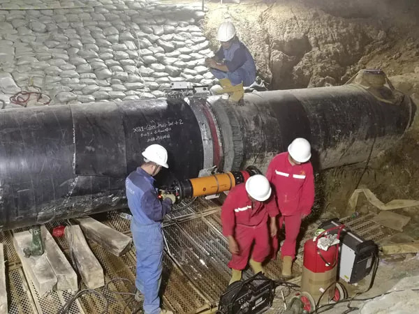 DR(數(shù)字射線)檢測(cè)焊口。DR(數(shù)字射線)檢測(cè)技術(shù)利用X射線的穿透特性和衰減特性,通過(guò)探測(cè)器獲得可被顯示和記錄的數(shù)字圖像。與傳統(tǒng)射線檢測(cè)技術(shù)相比,能夠在成像環(huán)節(jié)減少時(shí)間,同時(shí)在根焊、熱焊、填充一遍完成后進(jìn)行DR檢測(cè),確保了焊縫根部焊接質(zhì)量。