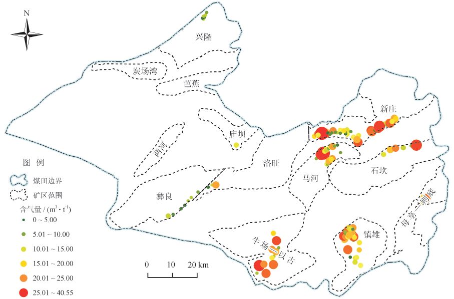 鎮(zhèn)威煤田煤層含氣量橫向上總體表現(xiàn)為東高西低的特征,彝良和廟壩礦區(qū)含氣量較低,一般不超過15 m3/t ;新莊礦區(qū)西部、馬河礦區(qū)、牛場—以古礦區(qū)和鎮(zhèn)雄礦區(qū)西北部煤層含氣量較高,一般介于9 ~ 18m3/t ;東部石坎礦區(qū)、母享—則底礦區(qū)及新莊礦區(qū)東部含氣量變化較大,一般介于5 ~ 20 m3/t,最大含氣量可達40 m3/t(圖3)。