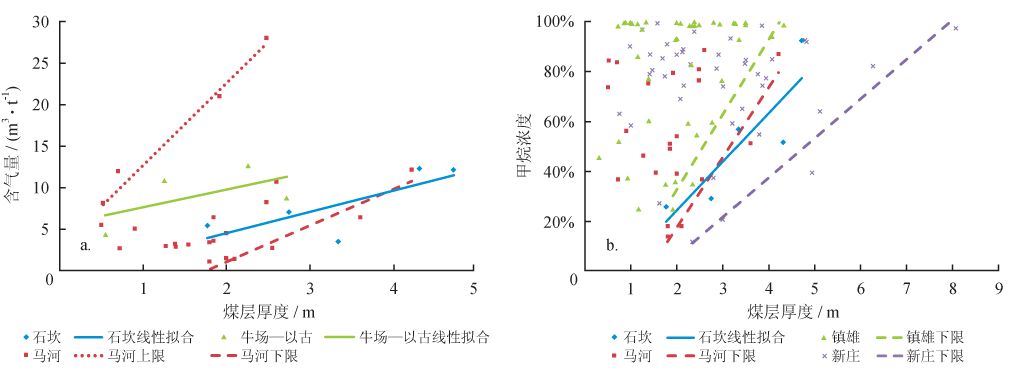 含氣量與煤厚大體上呈正相關(guān)關(guān)系,部分礦區(qū)含氣量與煤厚呈較明顯的線性正相關(guān)關(guān)系,如石坎礦區(qū)(相關(guān)系數(shù)R 為0.6)。較常見的情況是含氣量與煤層厚度之間存在一定的離散性,但其中煤層厚度與含氣量上限及含氣量下限同時存在較明顯的線性關(guān)系,如馬河礦區(qū)(圖5-a)。甲烷濃度的下限與煤厚普遍表現(xiàn)為正相關(guān)關(guān)系,反映煤層厚度的增加有助于煤層氣的保存(圖5-b)??傊簩雍穸炔粌H控制了煤儲層的生氣潛力,對煤層氣保存也有一定影響,在煤層頂?shù)装灞4鏃l件不理想的情況下,煤層厚度對含氣量的影響更為顯著。
