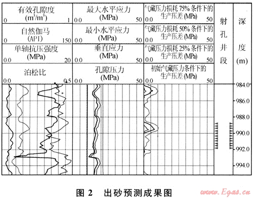 圖2中,988.7~992.0m井段為射孔層位。處理結(jié)果表明,在初始?xì)獠貕毫l件下,地層臨界出砂的生產(chǎn)壓差為1~10MPa;如果氣藏壓力下降25%(見氣藏壓力損耗25%條件下的生產(chǎn)曲線),那么,該射孔層位下部會出砂。