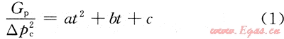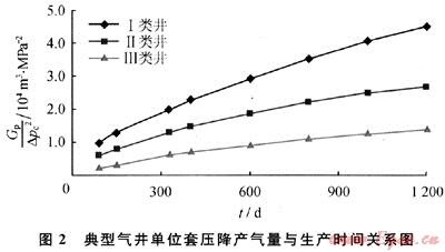 S6區(qū)塊是蘇里格氣田最早投產(chǎn)的區(qū)塊,其地質(zhì)條件與蘇里格氣田其他區(qū)塊相似,氣井的生產(chǎn)動(dòng)態(tài)也基本相似。S6區(qū)塊第一批生產(chǎn)井于2002年投產(chǎn),生產(chǎn)期已超過7a,氣井的滲流邊界已達(dá)到或接近真實(shí)的氣藏邊界,處于低壓低產(chǎn)中后期。在實(shí)際生產(chǎn)中,絕大部分氣井只進(jìn)行了井口油套壓和產(chǎn)量的監(jiān)測,對(duì)氣井的生產(chǎn)數(shù)據(jù)進(jìn)行分析,發(fā)現(xiàn)氣井的單位套壓降采氣量(Gp/△pc2)隨生產(chǎn)時(shí)間動(dòng)態(tài)變化,兩者之間呈良好的二次多項(xiàng)式關(guān)系,相關(guān)系數(shù)大于0.96。即