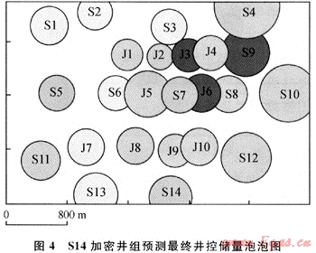 圖4是根據(jù)圖版預(yù)測得到的S14加密井組最終井控動(dòng)態(tài)儲(chǔ)量泡泡圖,可以看出它與生產(chǎn)早期的動(dòng)態(tài)分析結(jié)果(圖2)相比有很大差異。生產(chǎn)至廢棄時(shí),S14加密井組的平均最終井控動(dòng)態(tài)儲(chǔ)量為2920×104m3(最終可采出氣量為2480×104~2630×104m3),平均最終泄流面積為0.206km2,由于儲(chǔ)層具有較強(qiáng)的非均質(zhì)性。因此各單井的最終井控儲(chǔ)量和泄流面積之間存在較大的差異。