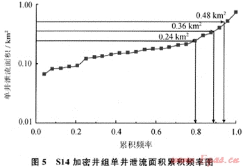 圖5是S14加密井組的單井泄流面積累積頻率圖,可知80%以上氣井的泄流面積小于0.24km2,95%以上氣井的泄流面積小于0.48km2,可推算出當(dāng)井排距為400m×600m時(shí),發(fā)生井間干擾的概率為7%~22%,而當(dāng)井排距為600m×800m時(shí),發(fā)生井間干擾的概率小于5%。