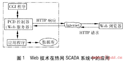 在采用基于Web技術用戶界面理念的熱網(wǎng)SCADA系統(tǒng)中,PCD控制器就代表了配備有圖形顯示功能的Web服務器。從根本上說,PCD控制器也是Web服務器,操作界面僅只是客戶端而已,這樣就簡化了通信過程。而常規(guī)熱網(wǎng)SCADA系統(tǒng)所采用的現(xiàn)場控制器不具備Web服務器的功能。
