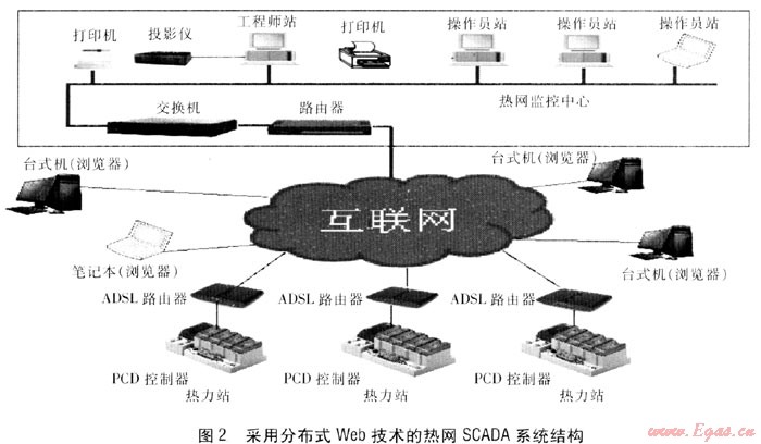 基于分布式Web技術的熱網(wǎng)SCADA系統(tǒng)的關鍵是建立Internet的連接從而訪問PCD控制器,該工程每座熱力站都通過ADSL路由器將PCD控制器連接到Internet。