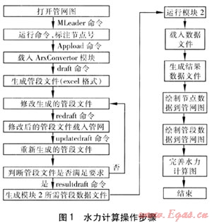 利用GPA軟件進(jìn)行水力計算,操作人員僅需熟悉AutoCAD與Excel的操作命令即可,簡便易懂。利用GPA軟件進(jìn)行水力計算的詳細(xì)操作步驟見圖1。