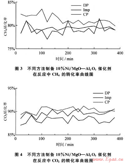 用不同方法制備4%MgO-Al203載體,用浸漬法負載Ni,制備成10%Ni/4%MgO-Al203催化劑,在常壓固定床反應(yīng)器中測得CHn的轉(zhuǎn)化率(XCH4)和C02的轉(zhuǎn)化率(XCO2)(圖3、4)。從圖3、4中可以看出,在反應(yīng)開始階段共沉淀法制備的載體催化劑的初始活性較高,可以超過90%,高于沉積沉淀法和浸漬法的催化活性,隨著反應(yīng)時間的進行,CH4和C02的轉(zhuǎn)化率始終保持較高,但反應(yīng)進行4h后,催化劑發(fā)生了積炭,催化活性有所降低,說明其穩(wěn)定性不是很好。