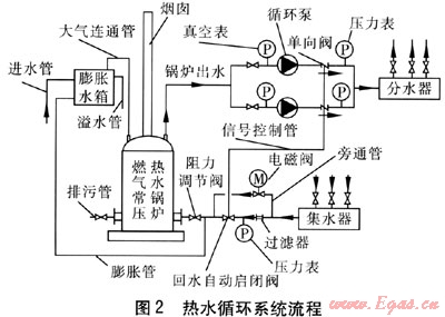 熱水循環(huán)系統(tǒng)流程見圖2。循環(huán)泵設(shè)在鍋爐的出水側(cè),即燃氣常壓熱水鍋爐出水管與循環(huán)泵入口連接。循環(huán)泵的揚程為管道水頭損失加上鍋爐與供熱系統(tǒng)最高點之間的重力水頭及附加水頭余量之和。