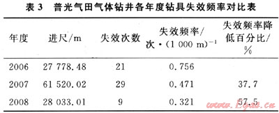 氣體鉆井施工中鉆具斷裂頻率遠(yuǎn)高于鉆井液鉆井。鉆具斷裂不僅部分抵消了氣體鉆井技術(shù)的提速效果,而且給井下安全帶來(lái)隱患。預(yù)防和減少鉆具斷裂,對(duì)于提高井下安全以及推廣應(yīng)用氣體鉆井技術(shù)具有重要意義。對(duì)多只斷裂鉆具進(jìn)行理化性能檢驗(yàn)、金相分析、掃描電鏡和能譜分析、腐蝕產(chǎn)物XRD分析發(fā)現(xiàn):失效鉆具的化學(xué)成分、金相組織等均符合相關(guān)標(biāo)準(zhǔn);僅個(gè)別鉆桿的屈服強(qiáng)度和縱向沖擊功不符合API Spec 5D標(biāo)準(zhǔn);鉆桿為疲勞或腐蝕疲勞斷裂;鉆鋌為典型的疲勞斷裂;鉆具腐蝕類型為氧腐蝕。氣體鉆井鉆具失效的主要原因是[4]:①氧腐蝕和沖蝕。氣體鉆井中,注入氣體中含有約20%的氧氣,若鉆進(jìn)井段地層出水或進(jìn)行霧化、泡沫鉆井時(shí),則極易發(fā)生氧腐蝕。②鉆柱反轉(zhuǎn)。鉆具質(zhì)量不平衡、鉆柱轉(zhuǎn)動(dòng)時(shí)產(chǎn)生的離心力以及鉆柱與井壁間的摩擦力是引起鉆柱反轉(zhuǎn)的三要素。反轉(zhuǎn)使鉆具承受高頻高幅交變彎曲應(yīng)力。當(dāng)鉆柱沿井壁作純滾動(dòng)時(shí),反轉(zhuǎn)速度最高。反轉(zhuǎn)運(yùn)動(dòng)對(duì)鉆具失效有嚴(yán)重影響。氣體鉆井中,鉆柱與井壁間幾乎為干摩擦,因而更容易產(chǎn)生反轉(zhuǎn)運(yùn)動(dòng),這是氣體鉆井比鉆井液鉆井鉆具失效頻率高的原因之一。牙輪鉆頭鉆井所用轉(zhuǎn)盤轉(zhuǎn)速(一般為50~80r/min)比空氣錘鉆井所用轉(zhuǎn)速(一般為15~30r/min)高。因此,牙輪鉆頭鉆井中鉆柱反轉(zhuǎn)運(yùn)動(dòng)更劇烈,這是牙輪鉆頭鉆井遠(yuǎn)比空氣錘鉆井鉆具失效頻率高的原因之一。③鉆柱縱向振動(dòng)。鉆柱振動(dòng)是導(dǎo)致鉆柱疲勞破壞的主要因素,主要包括橫向振動(dòng)、扭轉(zhuǎn)振動(dòng)和縱向振動(dòng),在直井中以縱向振動(dòng)為主。牙輪鉆頭鉆硬地層時(shí)會(huì)引起兩種頻率的縱向振動(dòng):因鉆頭輪齒滾動(dòng)而產(chǎn)生的高頻小位移縱振和因波狀井底引起的低頻大位移縱振。前者對(duì)碎巖有利,而后者對(duì)鉆具壽命影響很大。造成牙輪鉆井鉆具失效頻率高。④井眼彎曲。當(dāng)井斜較大,存在嚴(yán)重狗腿,鉆桿在彎斜井段旋轉(zhuǎn)時(shí),承受交變彎曲應(yīng)力,且狗腿以上井段鉆具斷裂次數(shù)少,狗腿以下井段鉆具斷裂次數(shù)明顯增多。⑤鉆鋌螺紋連接彎曲強(qiáng)度比不足。按照API標(biāo)準(zhǔn),Φ203.2mm、Φ228.6mm鉆鋌應(yīng)分別采用NC56、NC61螺紋,但普光氣田所用的同規(guī)格鉆鋌分別使用Φ168.3mm REG、Φ193.7mm REG螺紋,其BSR遠(yuǎn)低于NC56、NC61螺紋。現(xiàn)場(chǎng)所用鉆鋌螺紋連接彎曲強(qiáng)度比低和牙根應(yīng)力集中程度高,是鉆鋌多在母扣根部而非公扣處斷裂的主要原因。⑥缺乏探傷和精細(xì)管理,鉆具的使用時(shí)間可能超過了疲勞壽命。提出了氣體鉆井預(yù)防鉆具失效措施,主要包括空氣錘沖旋鉆井技術(shù)、優(yōu)化參數(shù)鉆柱防共振技術(shù)、加強(qiáng)鉆鋌螺紋探傷及選用高質(zhì)量鉆具等。這些技術(shù)的應(yīng)用取得了明顯的效果。鉆具失效頻率逐年降低(表3)。