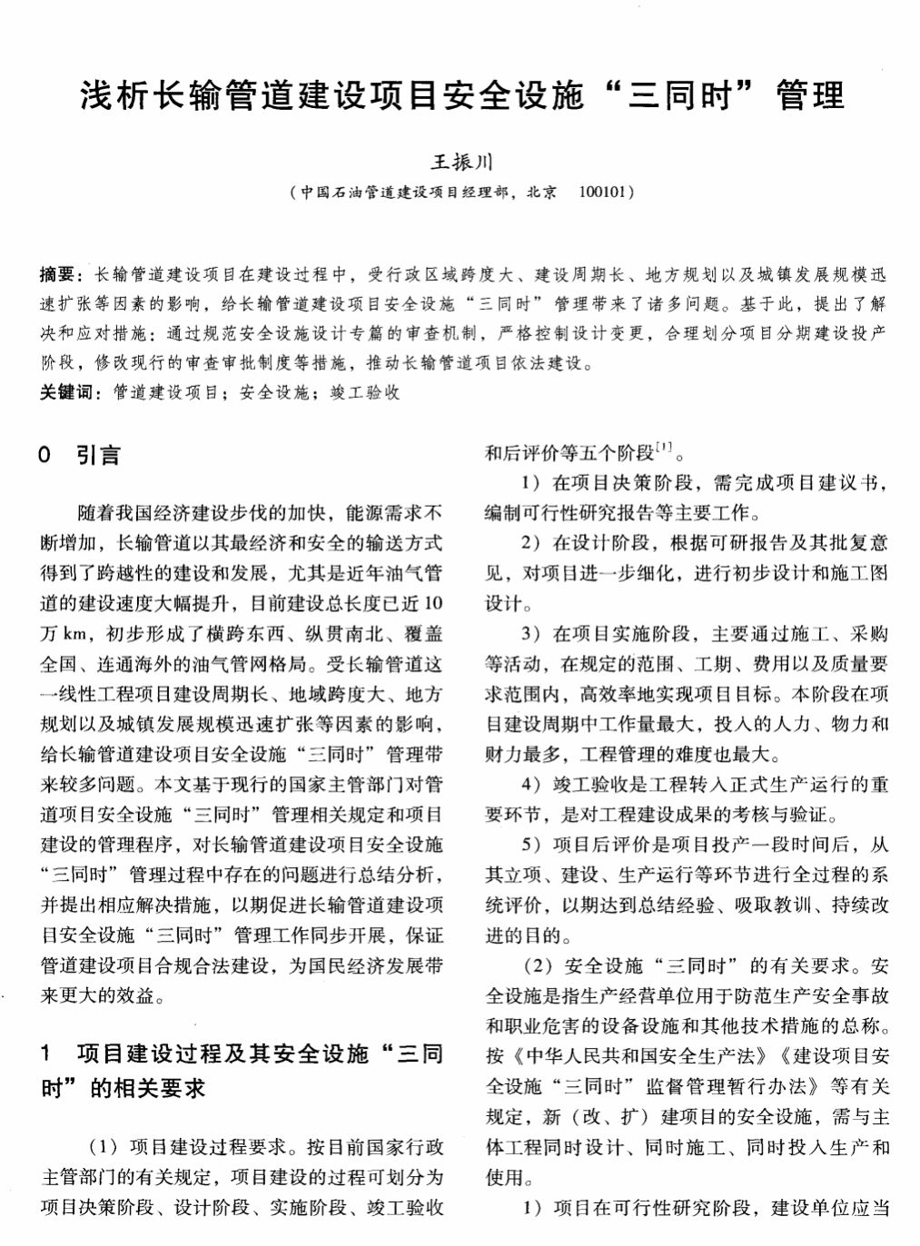 淺析長輸管道建設(shè)項目安全設(shè)施三同時管理:長輸管遒建設(shè)項目在建設(shè)過程中,受行政區(qū)域跨度大、建設(shè)周期長、地方規(guī)劃以及城鎮(zhèn)發(fā)展規(guī)模迅速擴(kuò)張等因素的影響,給長輸管道建設(shè)項目安全設(shè)施“三同時”管理帶來了諸多問題。