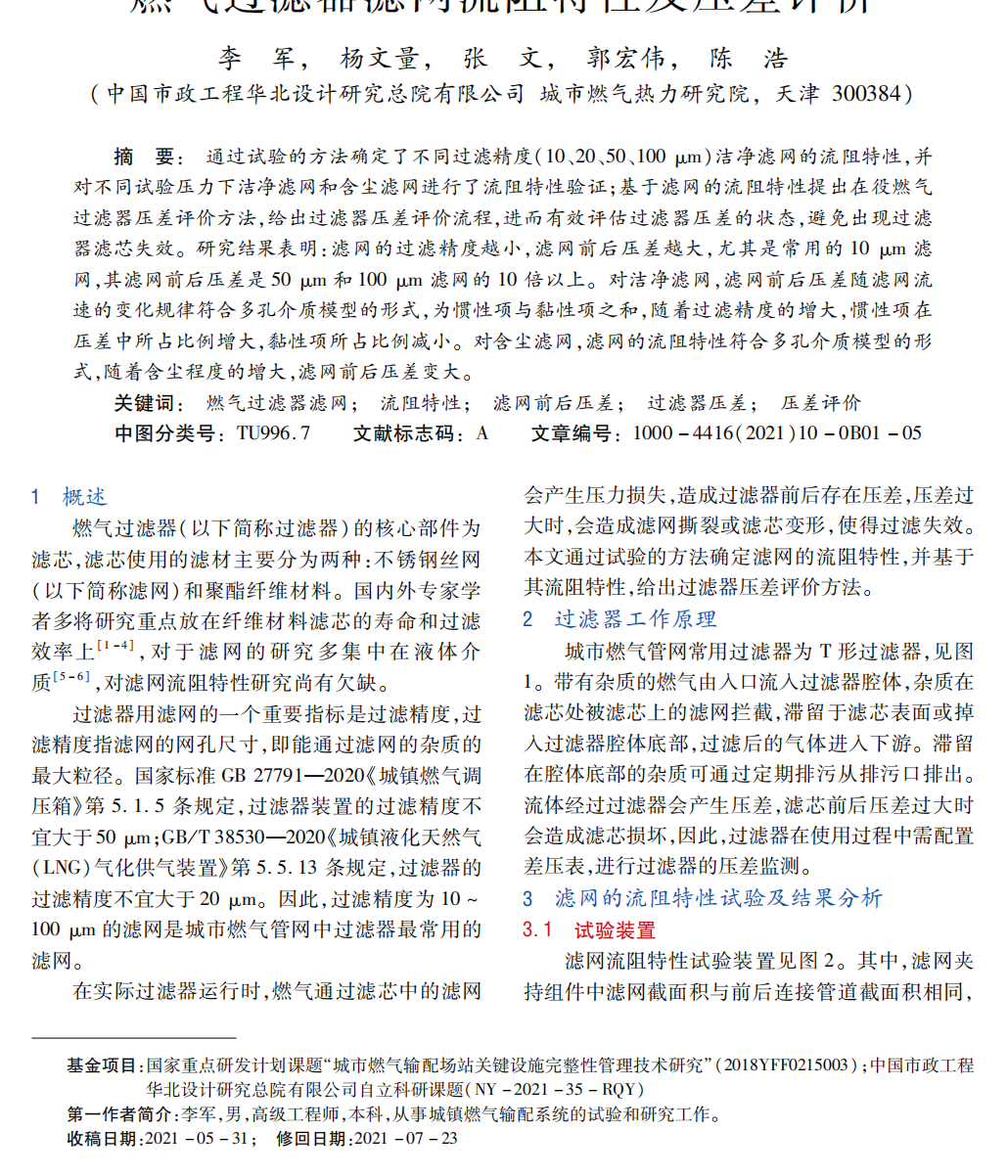 通過試驗(yàn)的方法確定了不同過濾精度(10、20 、50、 100 um)潔凈濾網(wǎng)的流阻特性,并對(duì)不同試驗(yàn)壓力下潔凈濾網(wǎng)和含塵濾網(wǎng)進(jìn)行了流阻特性驗(yàn)證;基于濾網(wǎng)的流阻特性提出在役燃?xì)膺^濾器壓差評(píng)價(jià)方法,給出過濾器壓差評(píng)價(jià)流程,進(jìn)而有效評(píng)估過濾器壓差的狀態(tài),避免出現(xiàn)過濾器濾芯失效。研究結(jié)果表明:濾網(wǎng)的過濾精度越小,濾網(wǎng)前后壓差越大,尤其是常用的10 um濾網(wǎng),其濾網(wǎng)前后壓差是50 um和 100 um濾網(wǎng)的10倍以上。對(duì)潔凈濾網(wǎng),濾網(wǎng)前后壓差隨濾網(wǎng)流速的變化規(guī)律符合多孔介質(zhì)模型的形式,為慣性項(xiàng)與黏性項(xiàng)之和,隨著過濾精度的增大,慣性項(xiàng)在壓差中所占比例增大,黏性項(xiàng)所占比例減小。對(duì)含塵濾網(wǎng),濾網(wǎng)的流阻特性符合多孔介質(zhì)模型的形式,隨著含塵程度的增大,濾網(wǎng)前后壓差變大。