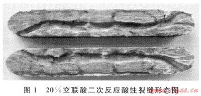 試驗(yàn)結(jié)果表明,20%膠凝酸鮮酸能得到一定的導(dǎo)流能力,10%膠凝酸(模擬殘酸)導(dǎo)流能力遠(yuǎn)遠(yuǎn)低于鮮酸,說(shuō)明酸液進(jìn)入裂縫的深部刻蝕能力降低,試驗(yàn)3與試驗(yàn)1相比,說(shuō)明閉合酸化能顯著提高裂縫導(dǎo)流能力。二次試驗(yàn)后平行板巖心的酸蝕溶孔道更為明顯,而且酸蝕孔道的深度更深,具有更高的導(dǎo)流能力(圖1)。說(shuō)明采用高黏度的交聯(lián)酸,無(wú)需進(jìn)行閉合酸化和多級(jí)注入工藝就可以獲得高的導(dǎo)流能力,而且由于酸巖反應(yīng)慢,活性酸能進(jìn)入地層深部,是進(jìn)行碳酸鹽巖地層深部改造的理想酸液體系。