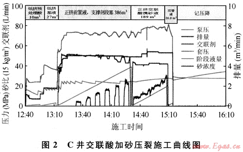 C井的交聯(lián)酸加砂壓裂是國(guó)內(nèi)外首次在井深超過(guò)5000m、溫度高于140℃地層中成功實(shí)現(xiàn)真正的交聯(lián)酸加砂施工,為碳酸鹽巖的儲(chǔ)層改造開(kāi)拓了新的、更廣闊的途徑,在碳酸鹽巖改造工藝突破的歷史進(jìn)程中具有里程碑的意義。