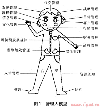 現(xiàn)代市場經(jīng)濟下的企業(yè)管理,就是帶有知識經(jīng)濟、網(wǎng)絡(luò)經(jīng)濟、信息經(jīng)濟色彩的企業(yè)管理,就是對技術(shù)、信息的把握,帶有中西方文化大融合特色對人的管理。各種管理理論都是管理學(xué)家站在不同角度,用不同語言解讀企業(yè)可持續(xù)發(fā)展規(guī)律的不同層次。而管理人模型(見圖1)就是以人為模板,按照人的幾大系統(tǒng)相互協(xié)作,以人的大腦指揮著兩只腳向目標(biāo)前進為基礎(chǔ)。確立“一個腦袋兩只腳”的管理人模型,就是具有戰(zhàn)略思維的“大腦”,指揮著圍繞市場活動的“經(jīng)營左腳”,圍繞企業(yè)內(nèi)部的“管理右腳”,帶動企業(yè)這個法人不停地向前走。