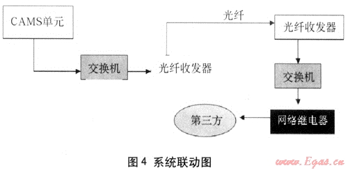 利用鋪設(shè)的備用光纖組建局域網(wǎng),通過交換機(jī)把5臺控制器接入,同時(shí)也將設(shè)置在“主調(diào)中心”內(nèi)部監(jiān)控中心的“CAMS單元”通過交換機(jī)接入整體系統(tǒng)來實(shí)現(xiàn)對前端5臺控制器的集中管理,利用CAMS單元的電子地圖功能來對防護(hù)目標(biāo)進(jìn)行實(shí)時(shí)監(jiān)控。“光纖收發(fā)器”和“網(wǎng)絡(luò)繼電器”以及“CAMS單元”來實(shí)現(xiàn)前端管道現(xiàn)場其它設(shè)備的聯(lián)動(dòng)(圖4)。